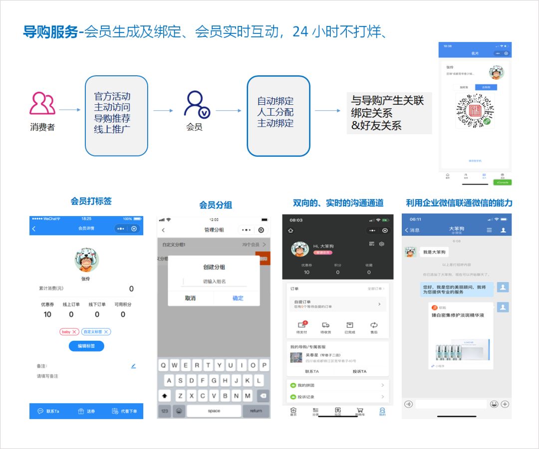 【2】利用企业微信联通微信的能力,可以搭建导购与会员之前双向的、实时的沟通通道;咨询、推广、分享、营销,都可以通过微信生态无缝对接;
